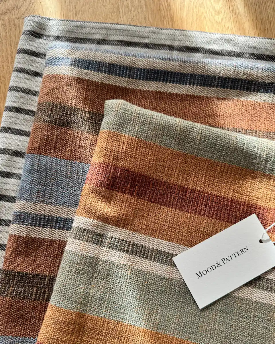 We prioritise natural fibres, such as linen, cotton, jute and wool. Occasionally, synthetic fibres are blended in to enhance durability.