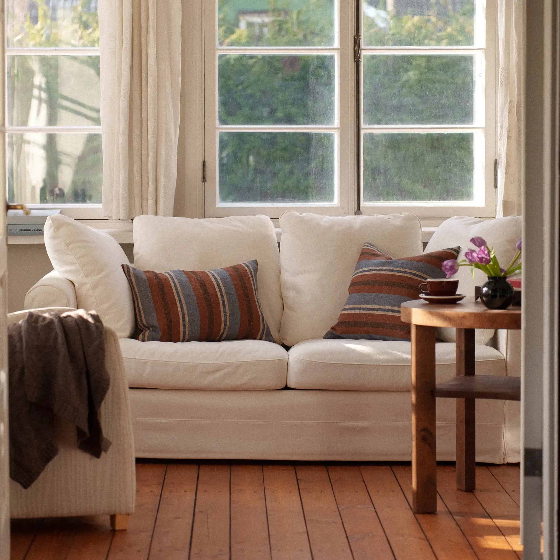 The design draws on the refined rhythm of stripes, expressed through natural fibres. Handwoven using a slow, artisanal process, the fabric develops a distinctive texture and quiet depth. Soft, considered tones sit easily alongside natural materials. Each cushion cover is carefully handcrafted in the Mood & Pattern studio in Tallinn.