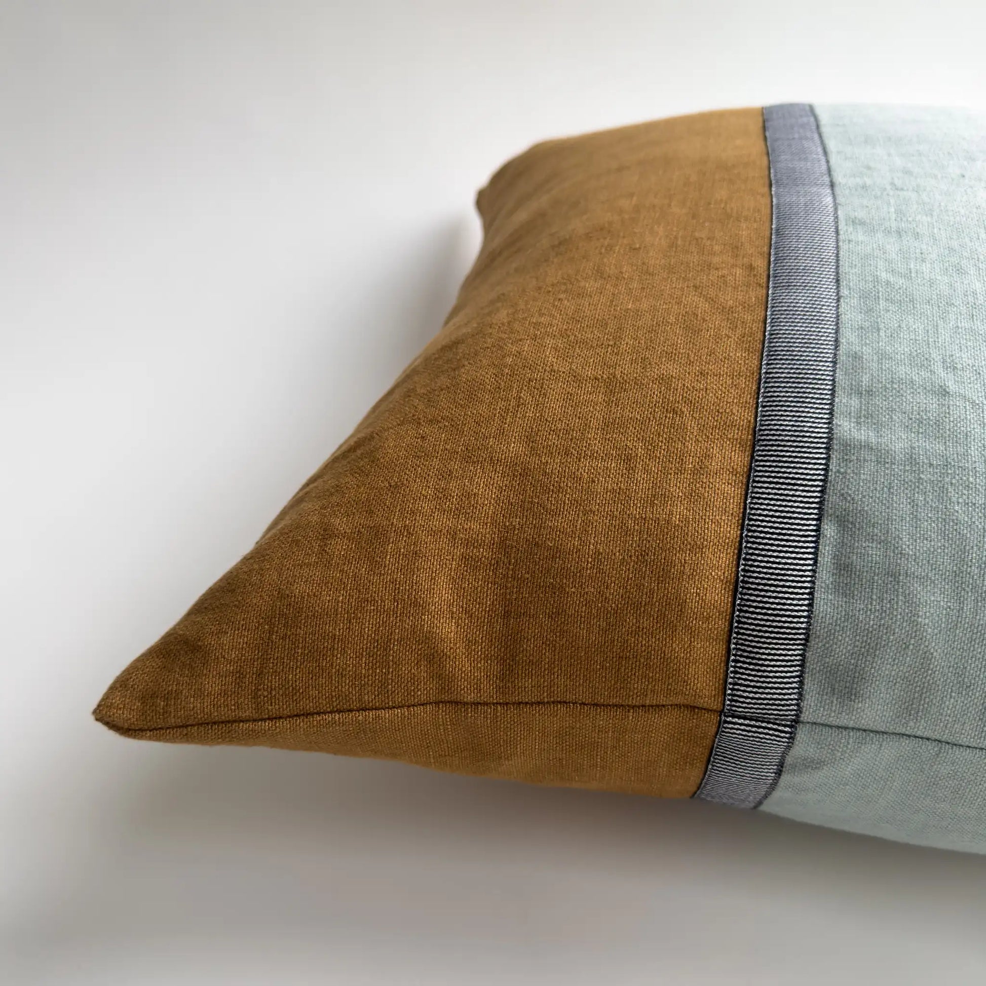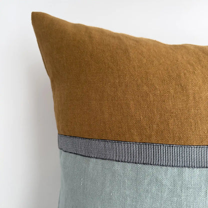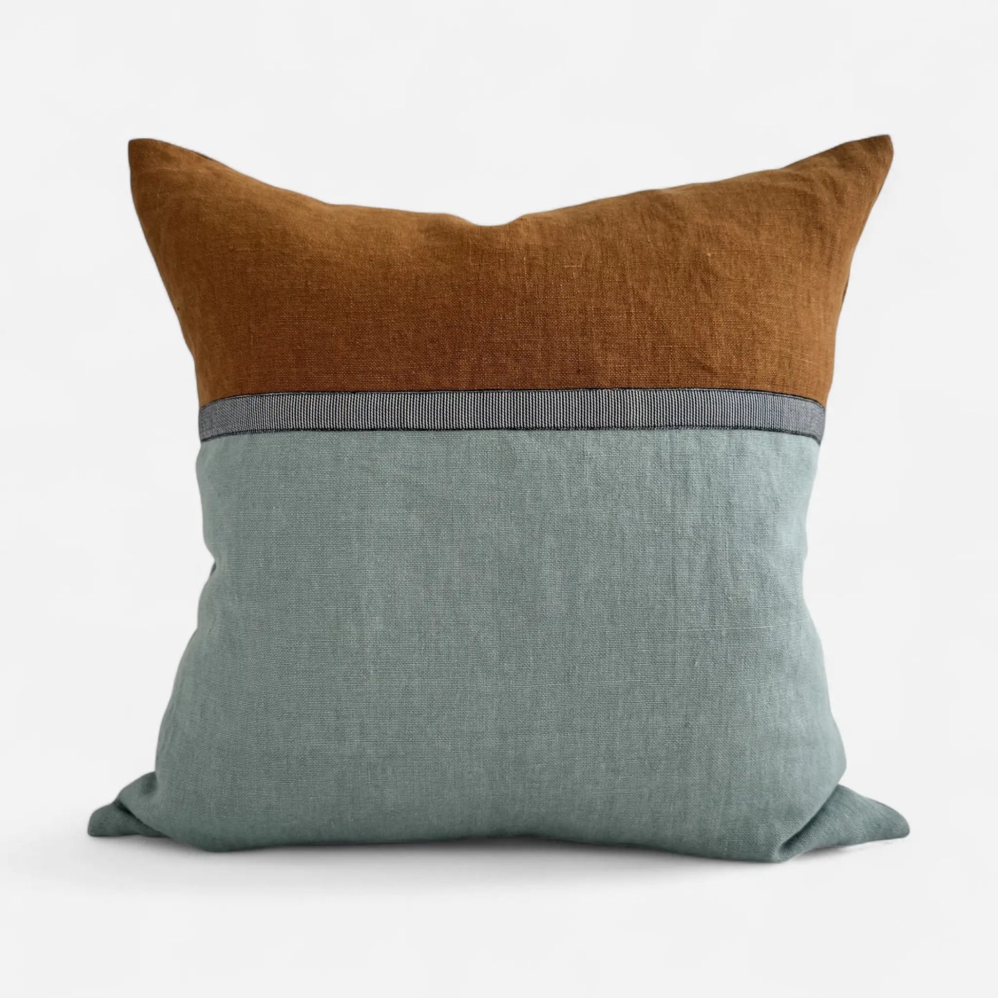 A true statement of laid-back luxury, the Horizon cushion cover is thoughtfully crafted from two complementary shades of stonewashed linen in duck egg and tan. The design is defined by a subtle black decorative ribbon.