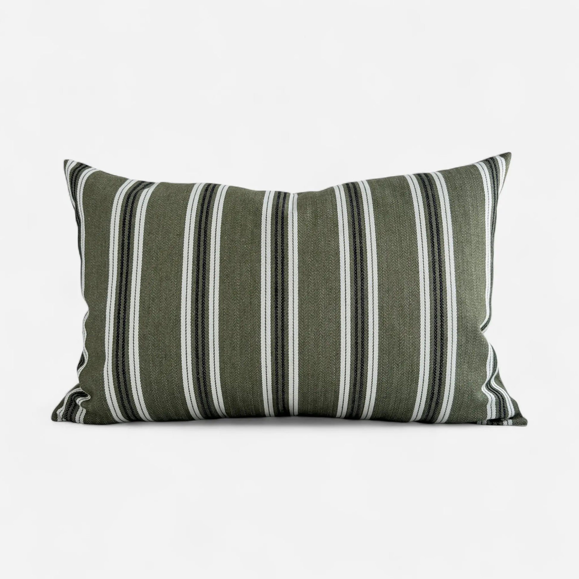 Inspired by the iconic striped houses of Costa Nova, the Joy of Living cushion cover embodies the light-hearted spirit and joie de vivre of the region. Featuring black and white stripes on an olive-green background, the design is a timeless addition to both contemporary and traditional interiors.