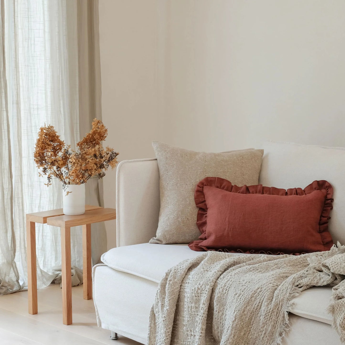 With the Essential Elegance collection, our aim was to let beauty be revealed in simplicity—in the texture, the muted palette, and the quiet allure of linen itself. For this playful variation, a delicate ruffle was added to introduce a soft touch of whimsy. Each cover is handcrafted with care and attention to detail in our Tallinn studio.
